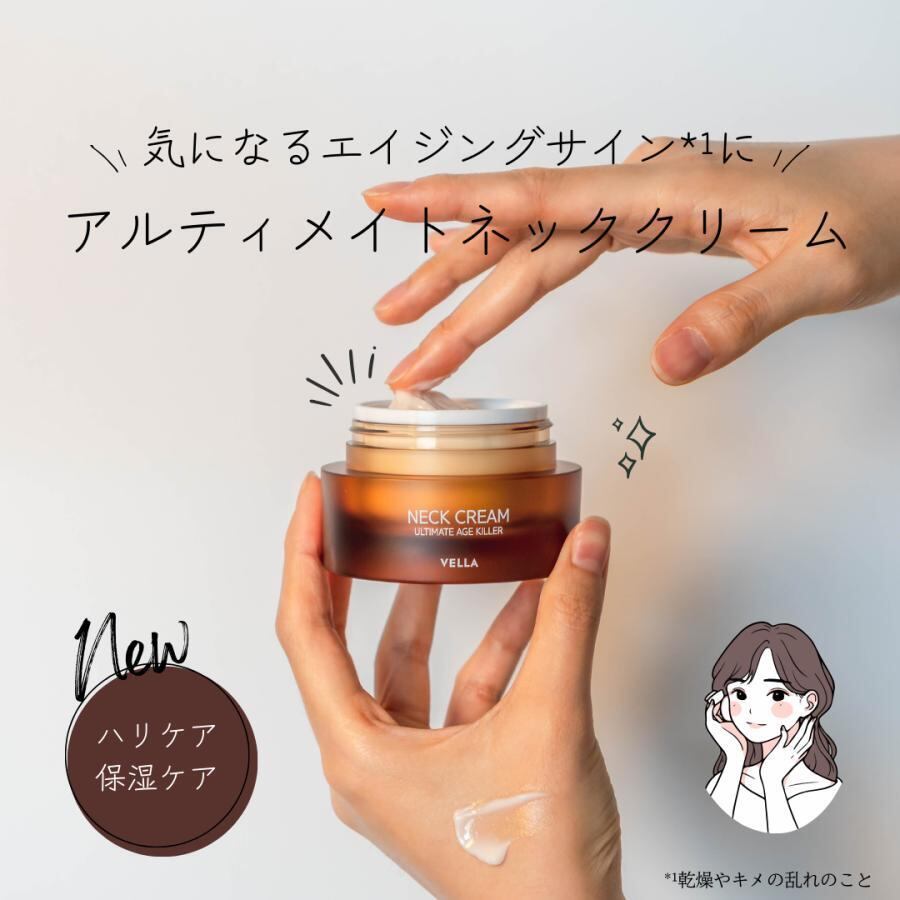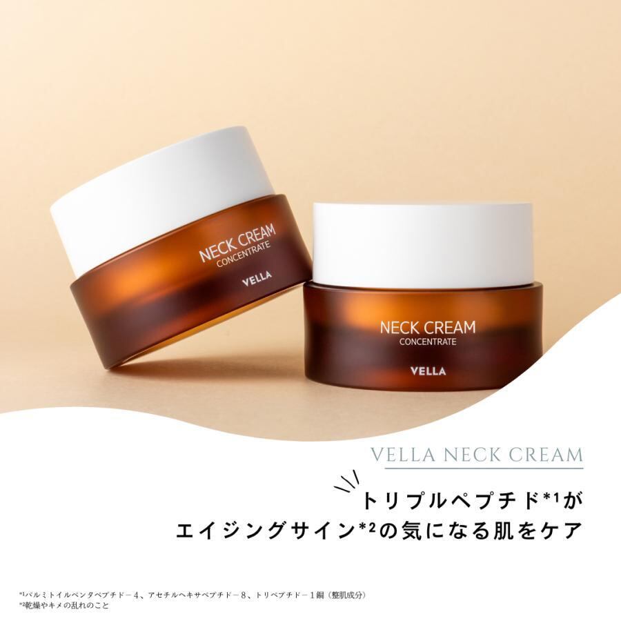 VELLA(ベラ)コンセントレートネッククリームは、首元やデコルテに特化した集中ケアアイテムです。リッチなテクスチャーがうるおいを与え、ハリと弾力をサポートします。独自のトリプルペプチド配合が、ハリやエイジングケアに効果的です。首元のしわやたるみ、乾燥からお肌を守り、ツヤや弾力を与えます。日中の乾燥や環境ストレスからお肌を守り、夜間はリラックスしてお肌の再生をサポートします。VELLA(ベラ)コンセントレートネッククリームで、あなたの首元からエレガントな輝きを引き出しましょう。