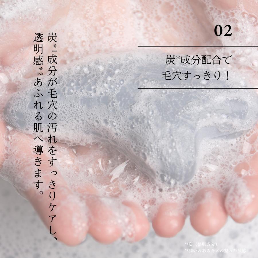 炭*成分が毛穴の汚れをすっきりケアし、透明感*あふれる肌へ導きます。